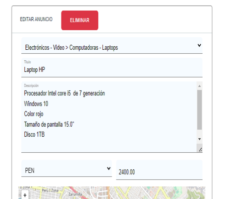 3. luego cuando hayas modificado el anuncio selecciona el boton "publicar",en el caso contrario si deseas eliminar el anuncio seleccionar en el boton "Eliminar"